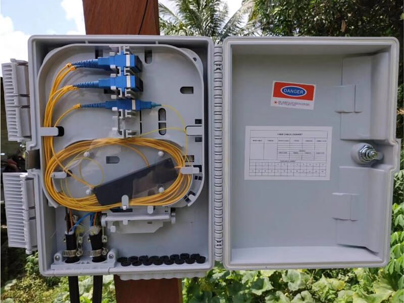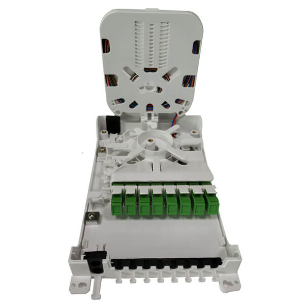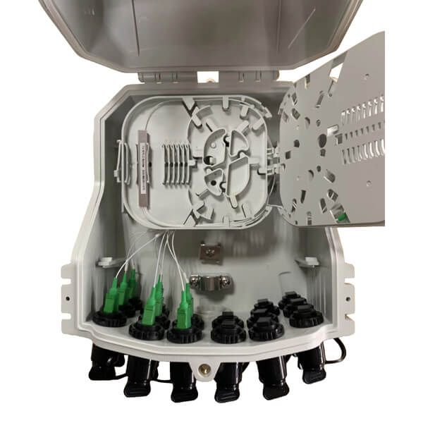 It is used as a termination point for the feeder cable to connect with the drop cable in the FTTx network system. Each Fiber distribution box has integrated strength member tie positions and bends radius protection with the addition of a removable front door allowing for quick and easy installation.