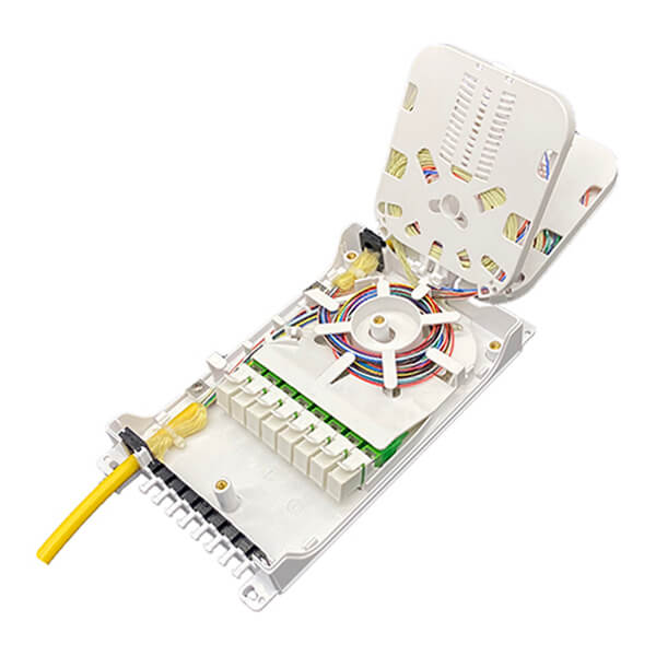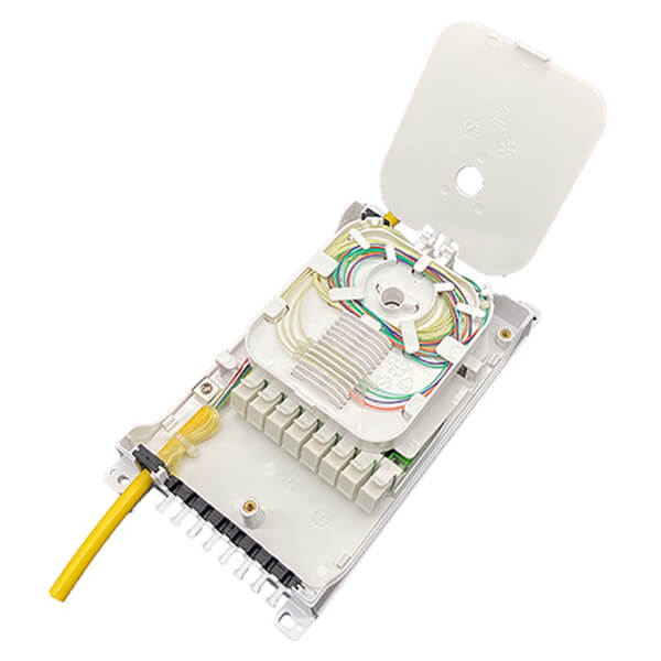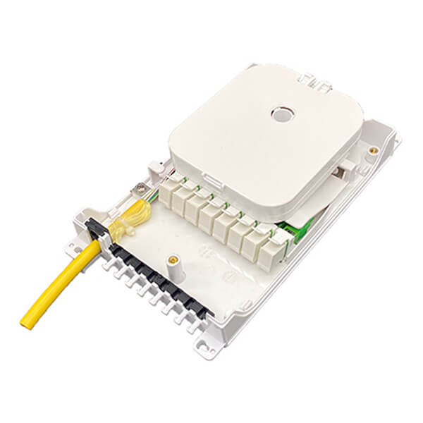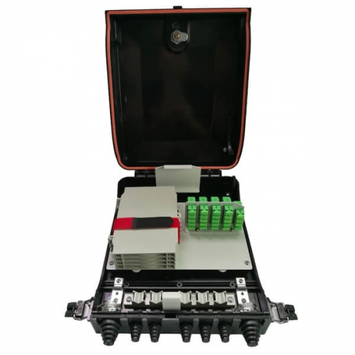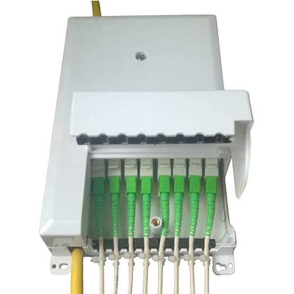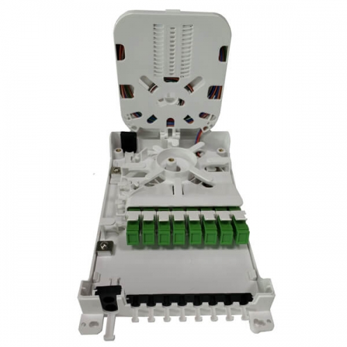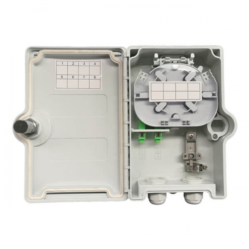 New design 8 ports Fiber Termination Box is designed for the FTTx project and provide mechanical protection for fiber management system that include the functions of patching, splicing and passive optic components integration indoor or outdoor environments. This fiber distribution box is typically used with 1×4 or 1×8 Micro PLC Splitter & mounted with SC or LC Fiber adapter for FTTx access networks. It is the special type Fiber optic splitter terminal box, it support wall mount installation, be made of high impact plastic. Anti-UV,Ultra violet resistant and rainfall resistant.